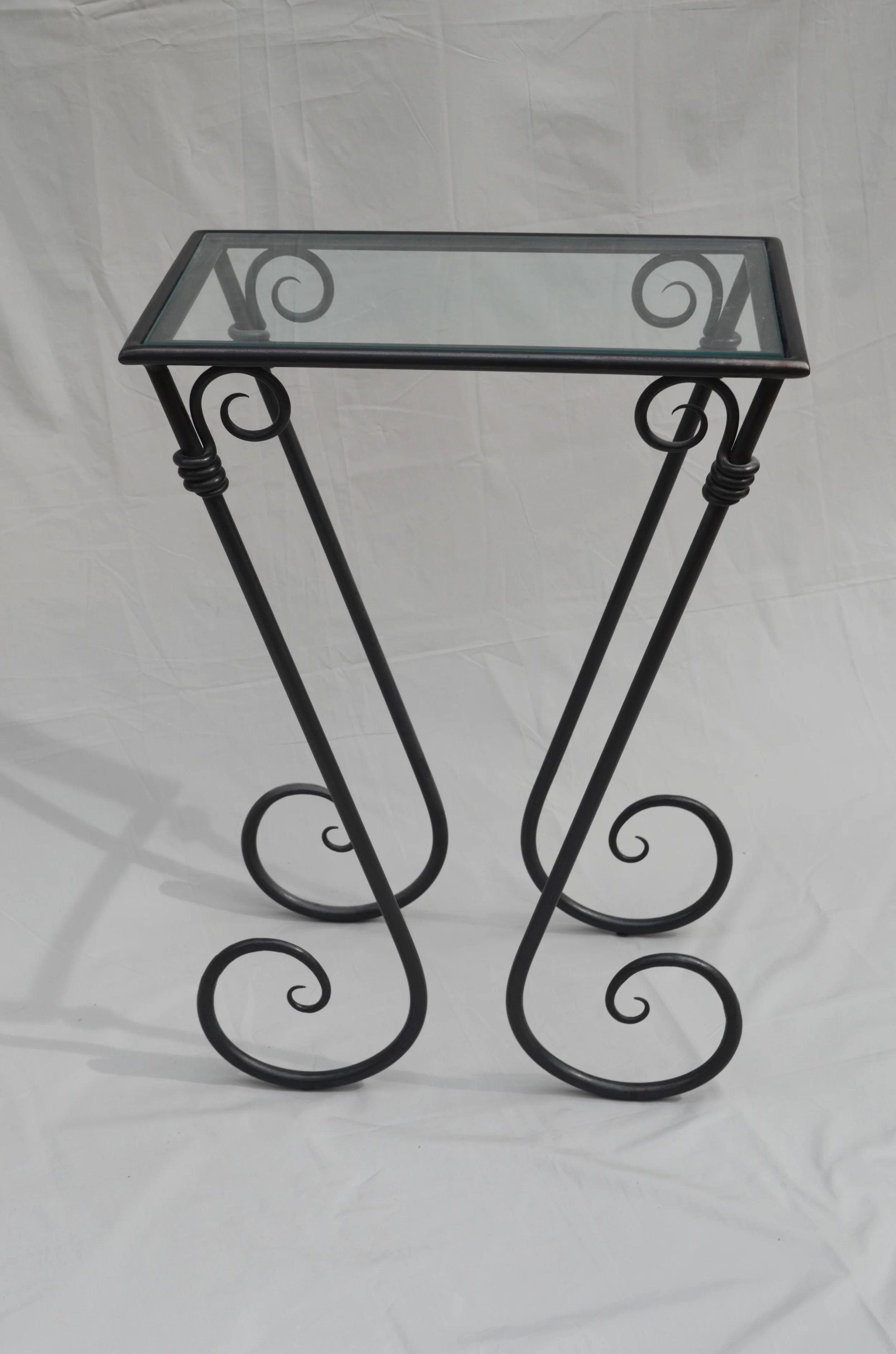 This is a whimsical, glass top end table that was created originally with a matching sofa table. Both were forged and fabricated from steel rod stock. While the tables are functional pieces, inspired by Western US cattle ranching, they are also elegant, feminine, and express a lot of visual movement.
